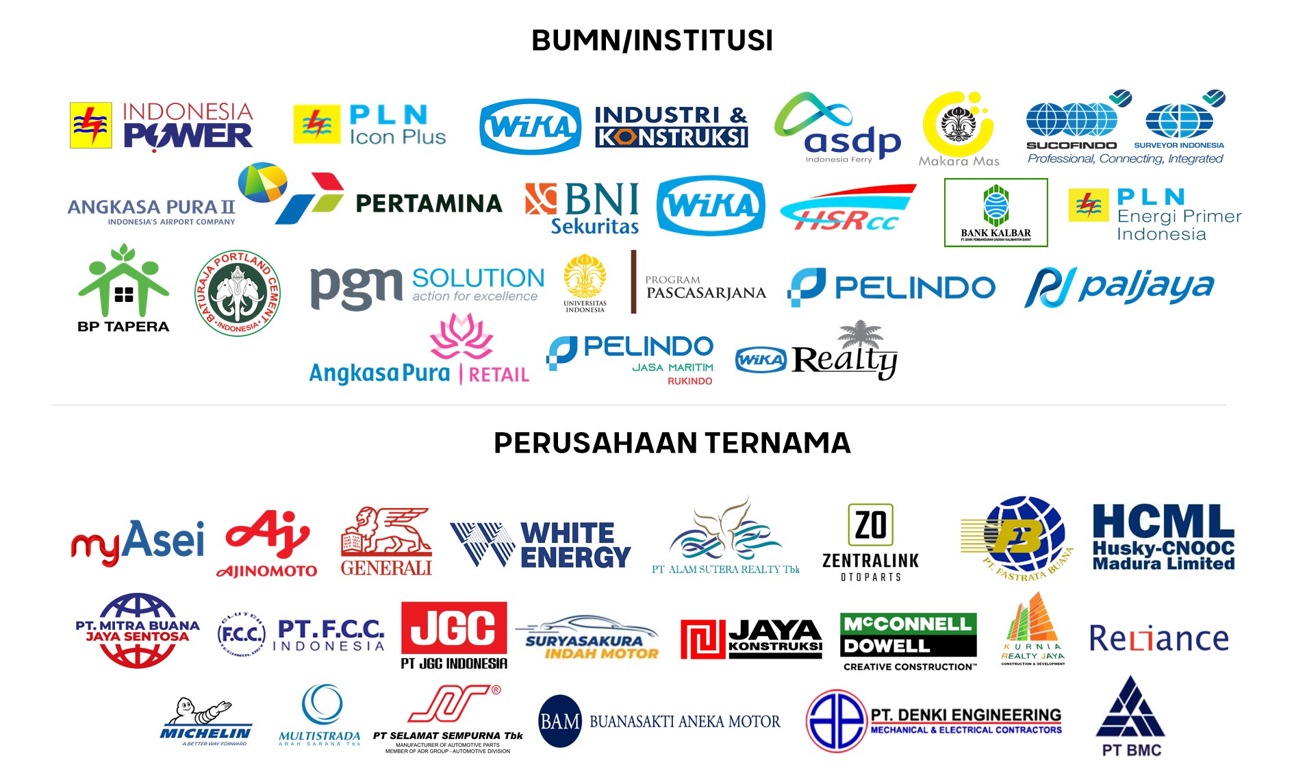 Kami telah dipercaya oleh berbagai klien, mulai dari BUMN berskala nasional, perusahaan swasta terkemuka, hingga berbagai institusi lainnya.
